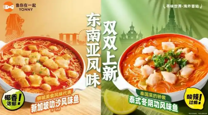 10月中旬,知名酸菜鱼品牌鱼你在一起在国内正式推出新加坡叻沙风味鱼与泰式冬阴功风味鱼两款新品,将东南亚两个地域美食风味引入酸菜鱼品类,真正开始启动“寻味世界”产品战略,为行业提供了风味全球化的参考样本。