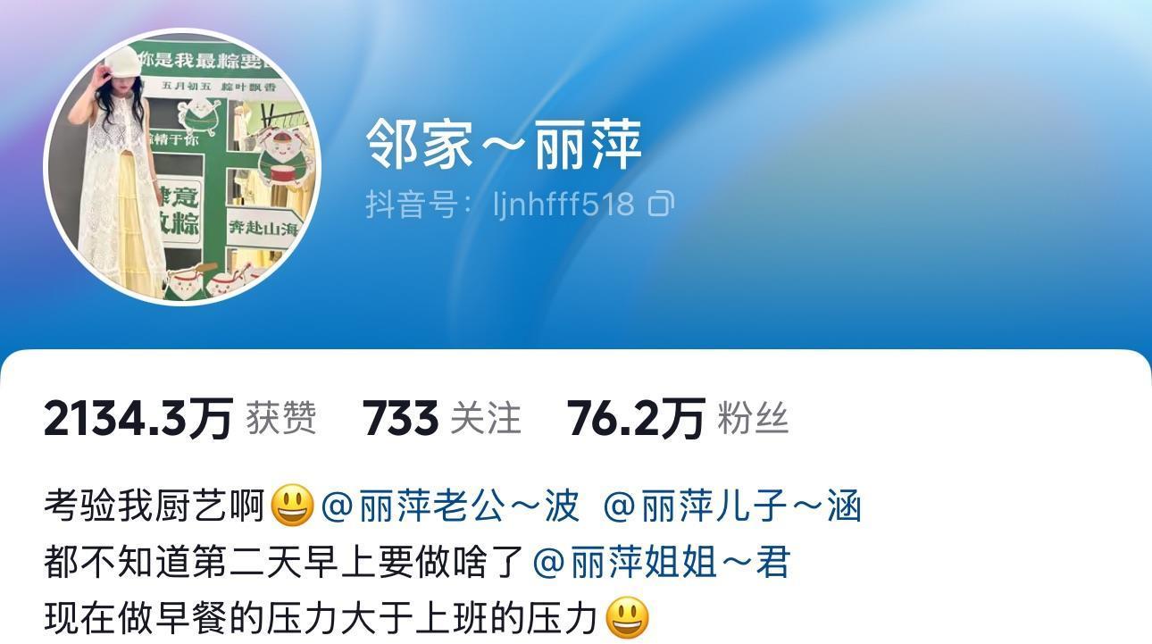 现在,丽萍的早餐视频已成为粉丝的“追更日常”。每天都有粉丝私信她:“明日何时更新”“明日预备了什么好吃的”“丽萍,还有半小时就要起来煮饭啦”,视频更新稍晚,就会有粉丝催更。丽萍方案晚上开直播和粉丝互动,有不少学生粉丝表明“周一要考试,看不了直播”而感到遗憾,丽萍也向他们发送了祝愿,让他们安心考试。还有网友主张她让儿子出镜做吃播,她婉拒道:“孩子还没满18岁,现在以学业为主。”应网友要求,丽萍给儿子也开通了交际账号,1月3日发布的第一条毛遂自荐视频就收成57.4万点赞,截止至发稿,该账号仅发布6条视频。粉丝数涨到14万。